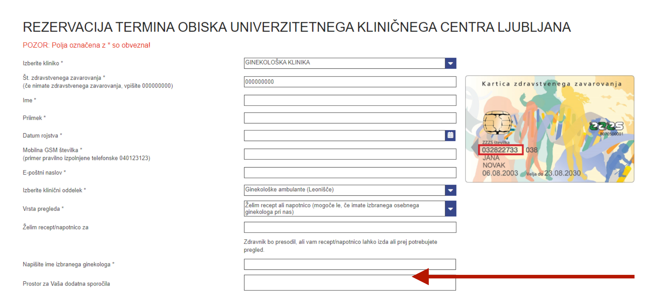 Če potrebujete recept za terapijo, ki vam ga ponavadi izda vaš izbrani ginekolog, lahko oddate zahtevek na (slika 1). Rezervacija termina obiska UKC Ljubljana. Zdravnik bo vaš zahtevek prejel in presodil ali vam recept lahko izda ali potrebujete prej še pregled. O napisanem receptu ali drugačni odločitvi vas bomo obvestili s telefonskim klicem v 14 dneh.